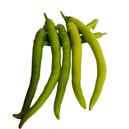 Light green chilies, often known for their mild to moderate heat, are a popular variety in many cuisines. These chilies typically have a vibrant, pale green color and a slender, elongated shape. They add a subtle spiciness to dishes without overwhelming the palate, making them versatile for various culinary applications.Mirch in Hindi.
